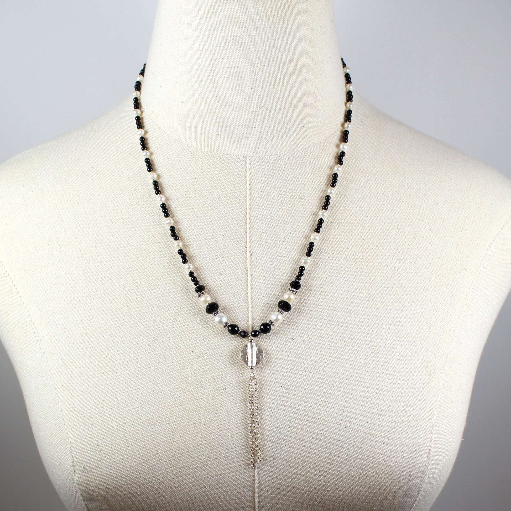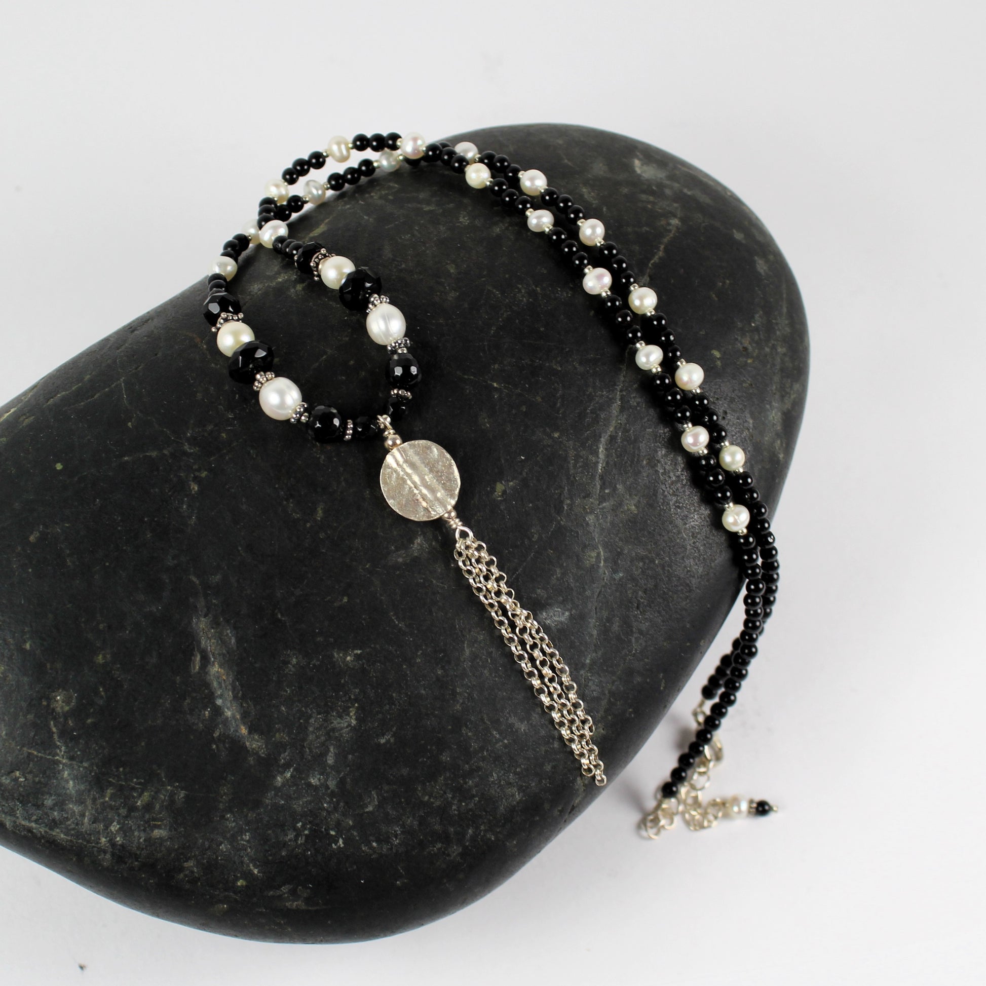 Black Onyx and Freshwater Pearls lead up to a Sterling Silver Hill Tribe Hammered Disc with a Sterling Chain Tassel. This fun necklace can be dressed up or down.
