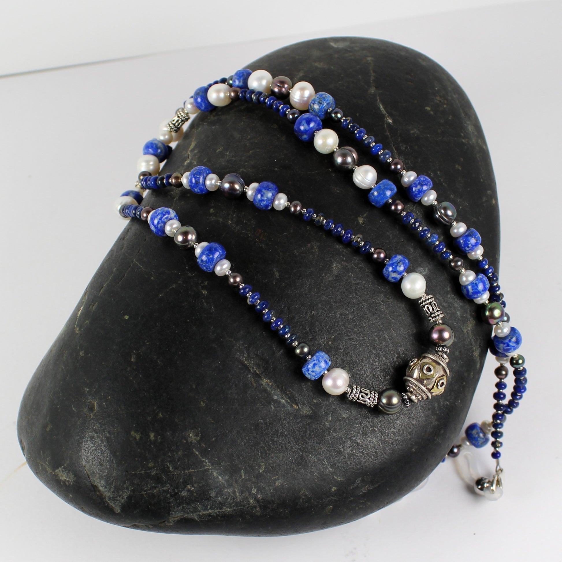 - Lapis, Sterling Silver, Freshwater Pearls, and delicate Seed Beads