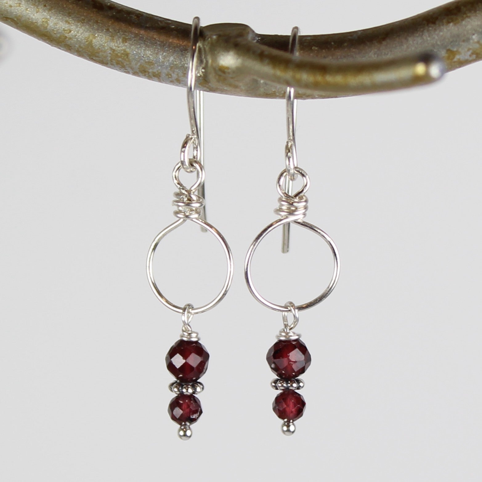 Faceted Garnets dangle off of Hand-Forged Sterling Silver Wire Loops