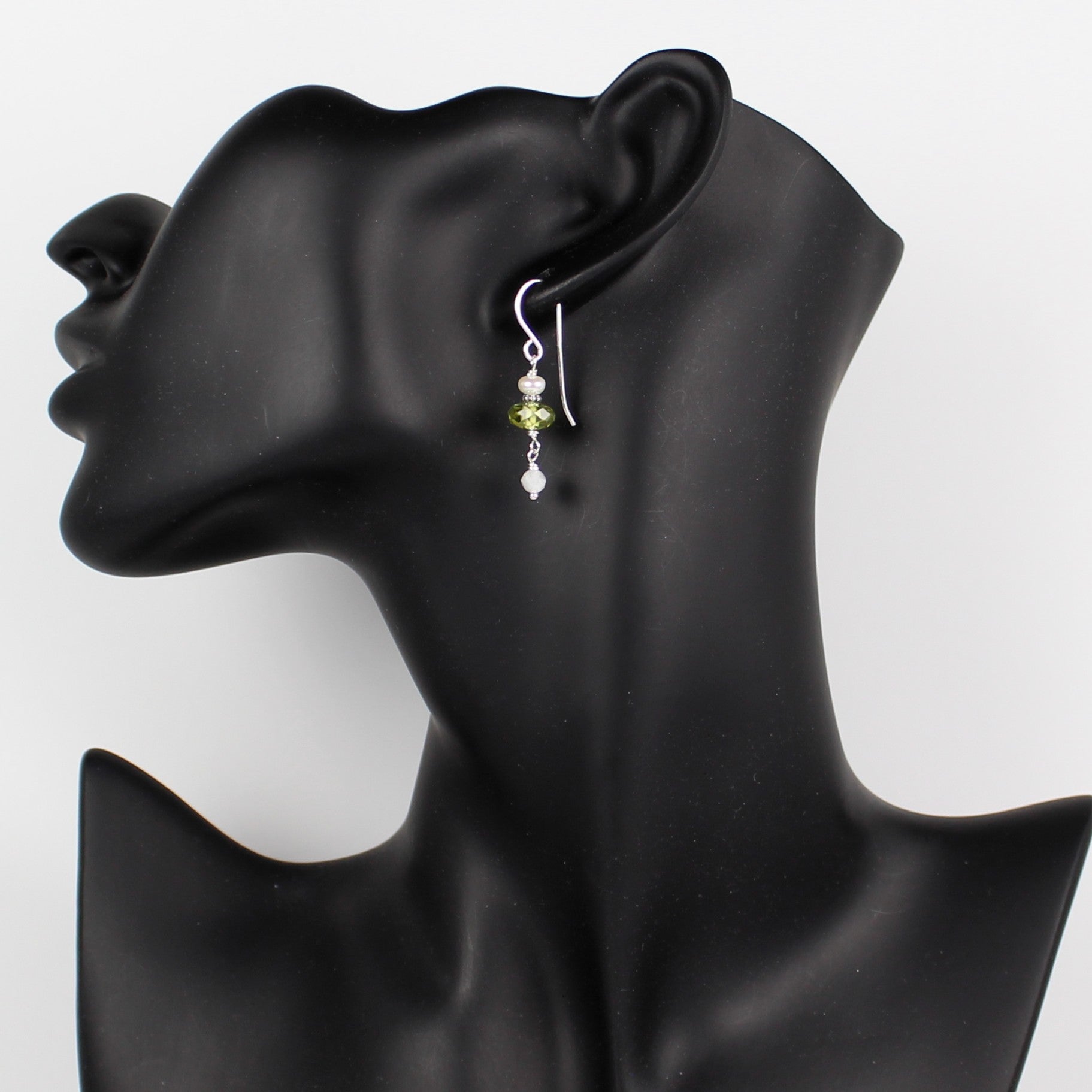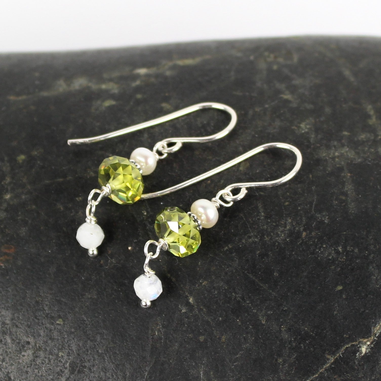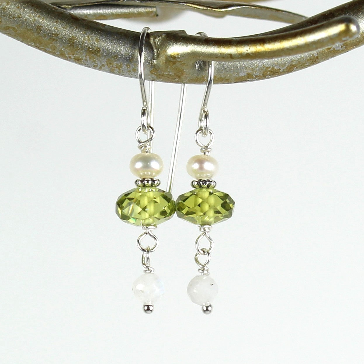 Round faceted Moonstones dangle from Lime Green Swarovski Crystal faceted Rondelle beads and small white Freshwater Pearls.