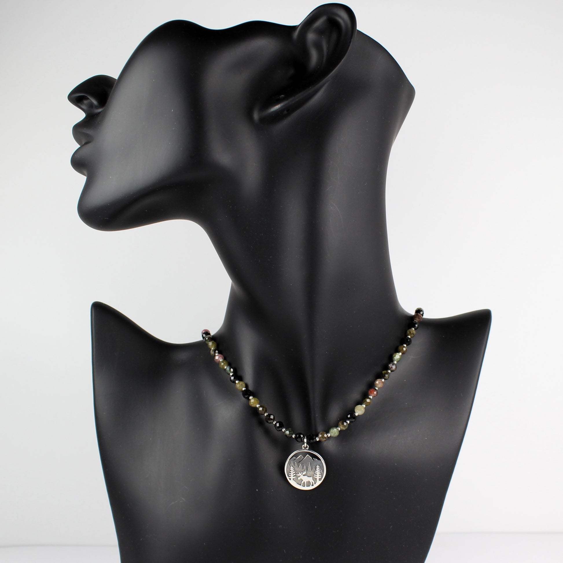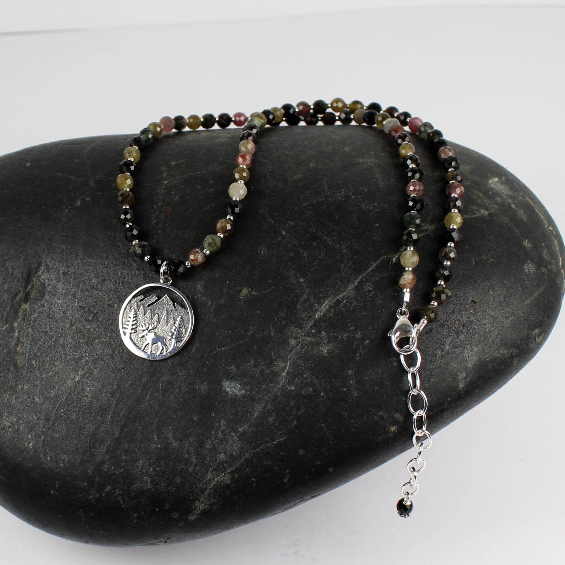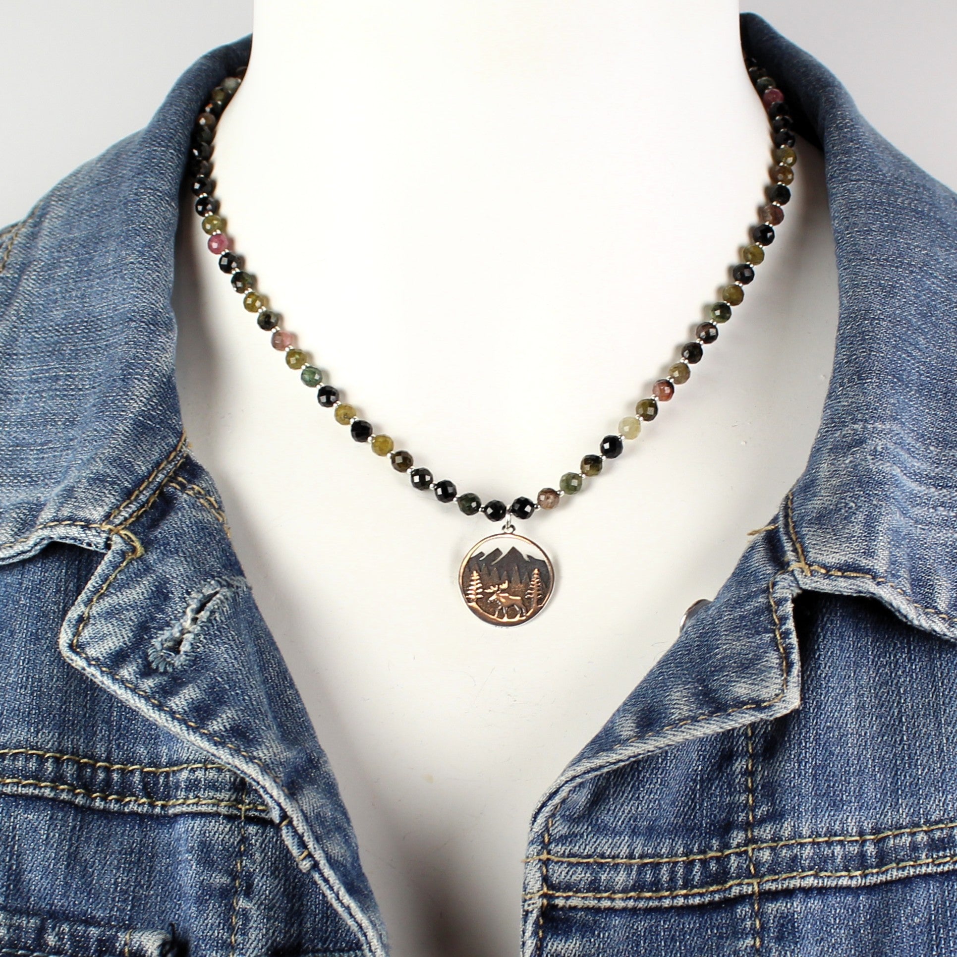 This Moose pendant is enhanced by faceted earthy Tourmaline beads.
