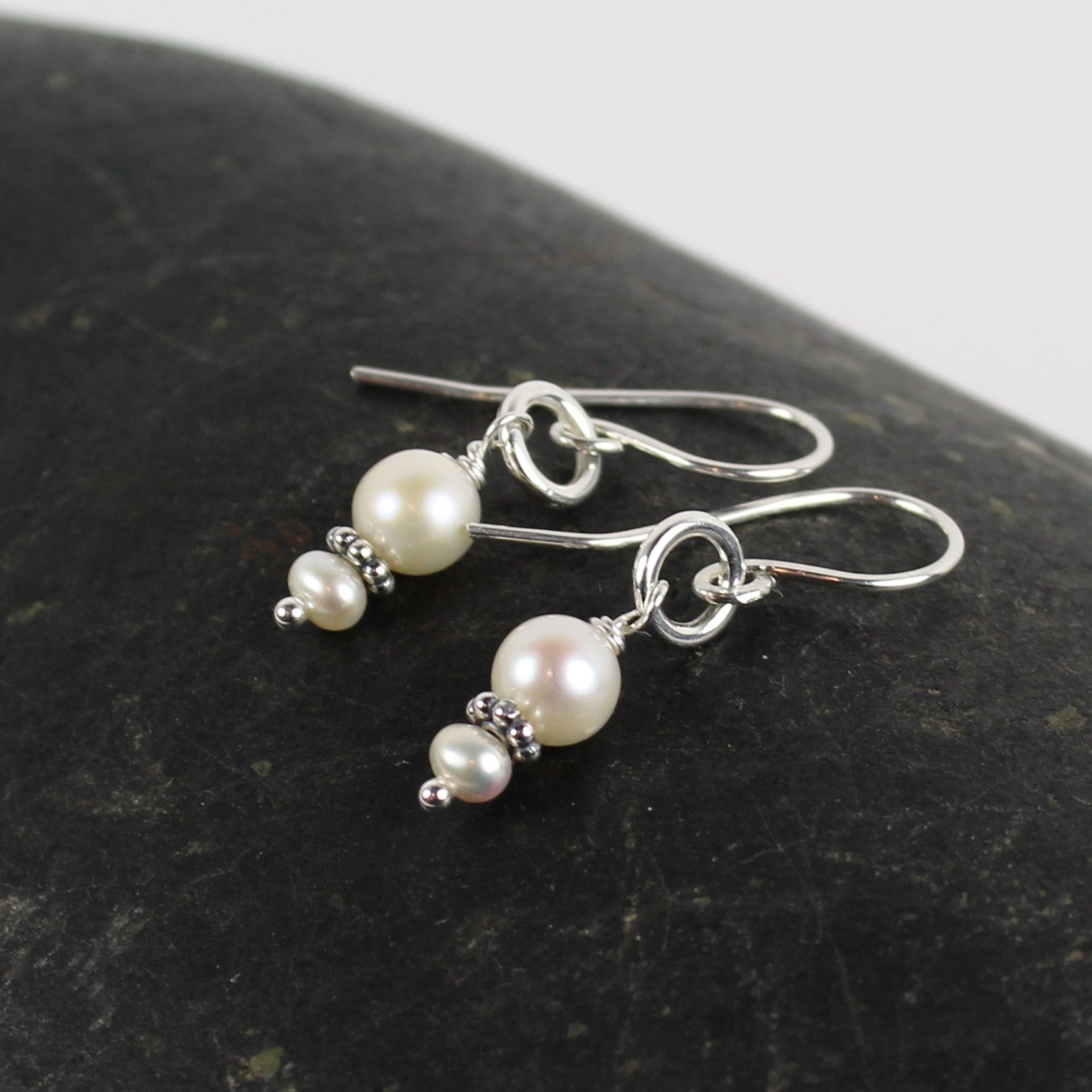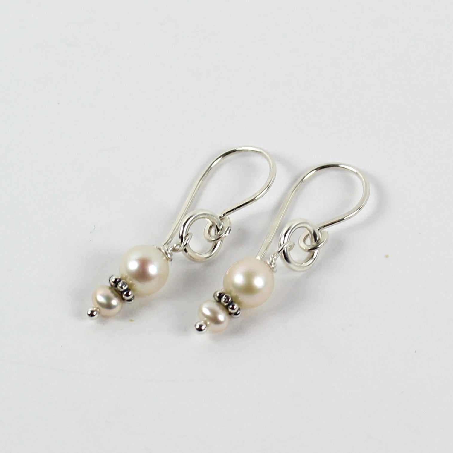 White Freshwater Pearls are enhanced by these Bali sterling daisy beads and dangle off of hand-forged heavy sterling earring wires.